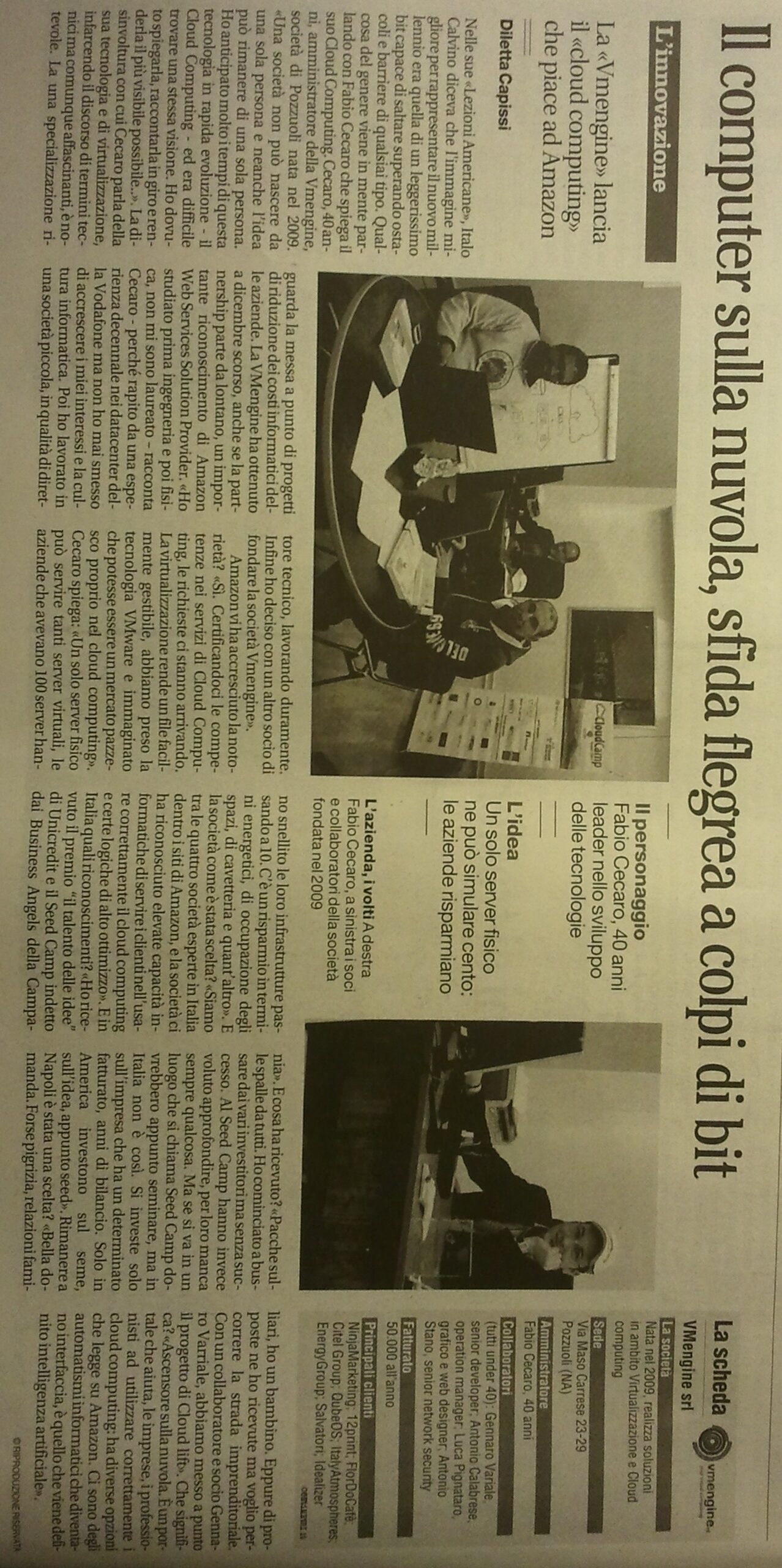 Today Il Mattino published the interview that the very kind Dr. Diletta Capissi did to us a couple of days ago. A beautiful and long interview that touched on the whole story from personal resumes to the birth of the startup VMengine, the difficulties of a too premature vision in a geographical area with very little stimulus and entrepreneurial help that does not exist, moreover in a period of birth of various economic crises.