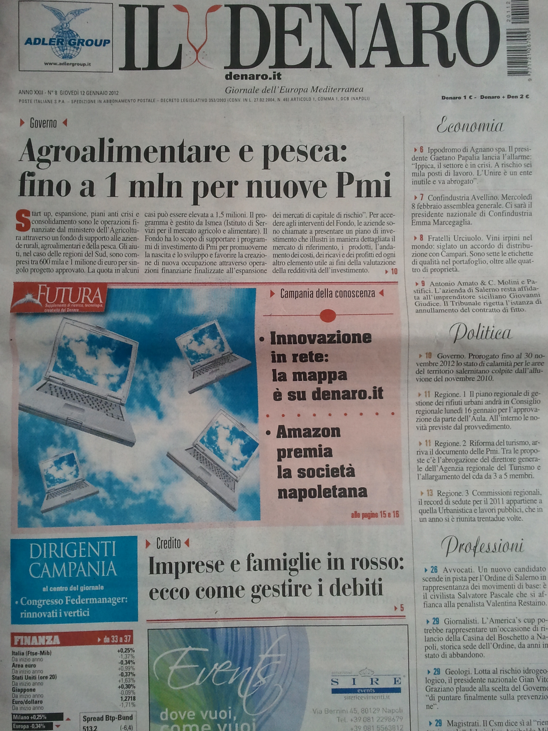 Successivamente al Cloud Camp, grazie all’invito dell’Associazione NOI (Napoli Open Innovation) abbiamo partecipato a due trasmissioni dell’ “Innovazione Diffusa” registrate al Denaro TV. Sul numero del Denaro del 4 novembre esce anche un articolo che descrive la puntata. “Si discute di “cloud computing”, cioè l’insieme dei software che sfruttano Internet per la gestione di informazioni […]