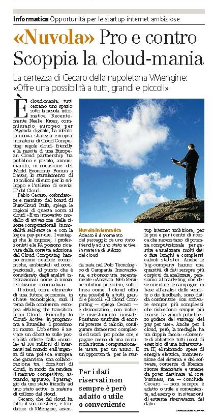 Ieri l’inserto di economia “Mezzogiorno Economia” del Corriere della sera (Corriere del Mezzogiorno) pubblica un pezzo sul cloud computing con una serie di nostre dichiarazioni.